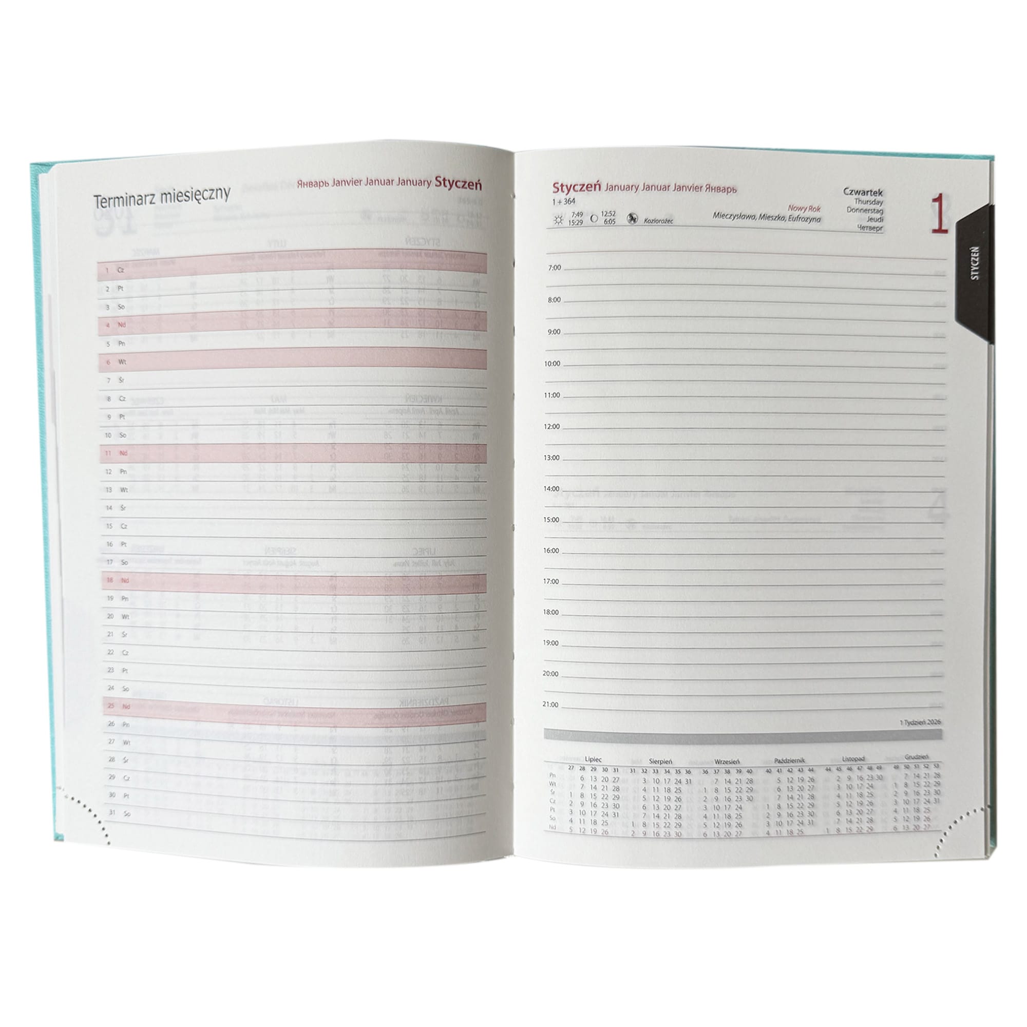 Ponadto, kalendarz oferuje kalendarium w pięciu językach, w tym polskim, angielskim, niemieckim, rosyjskim i francuskim. W kalendarium znajdziesz również imieniny i święta, a także przydatne informacje takie jak fazy księżyca oraz wschody i zachody słońca. Na dole każdej strony umieszczono plan całego roku, co ułatwia szybkie zarządzanie czasem. Dodatkowo, na wyklejce z przodu znajduje się mapa Europy, a z tyłu mapa Polski, co czyni go nie tylko praktycznym, ale i funkcjonalnym narzędziem.