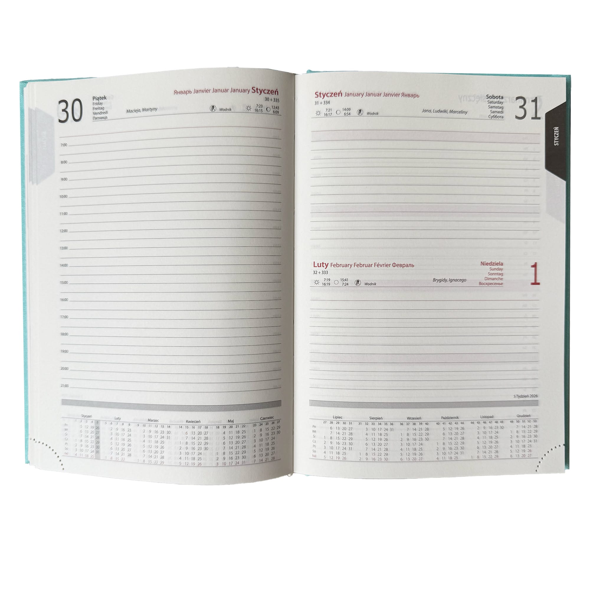 Kalendarz A5 dzienny 2026 to idealne rozwiązanie dla osób, które cenią sobie organizację i planowanie. Jego kompaktowy format 142 x 203 mm sprawia, że jest łatwy do przenoszenia i doskonale nadaje się do codziennego użytku. Dzięki układowi, w którym jeden dzień ma swoją stronę, a sobota oraz niedziela są ujęte na jednej stronie, możesz z łatwością monitorować swoje zadania i plany. Kalendarz zawiera 320 stron wykonanego z wysokiej jakości papieru chamois 70g/m2, co zapewnia komfort pisania.