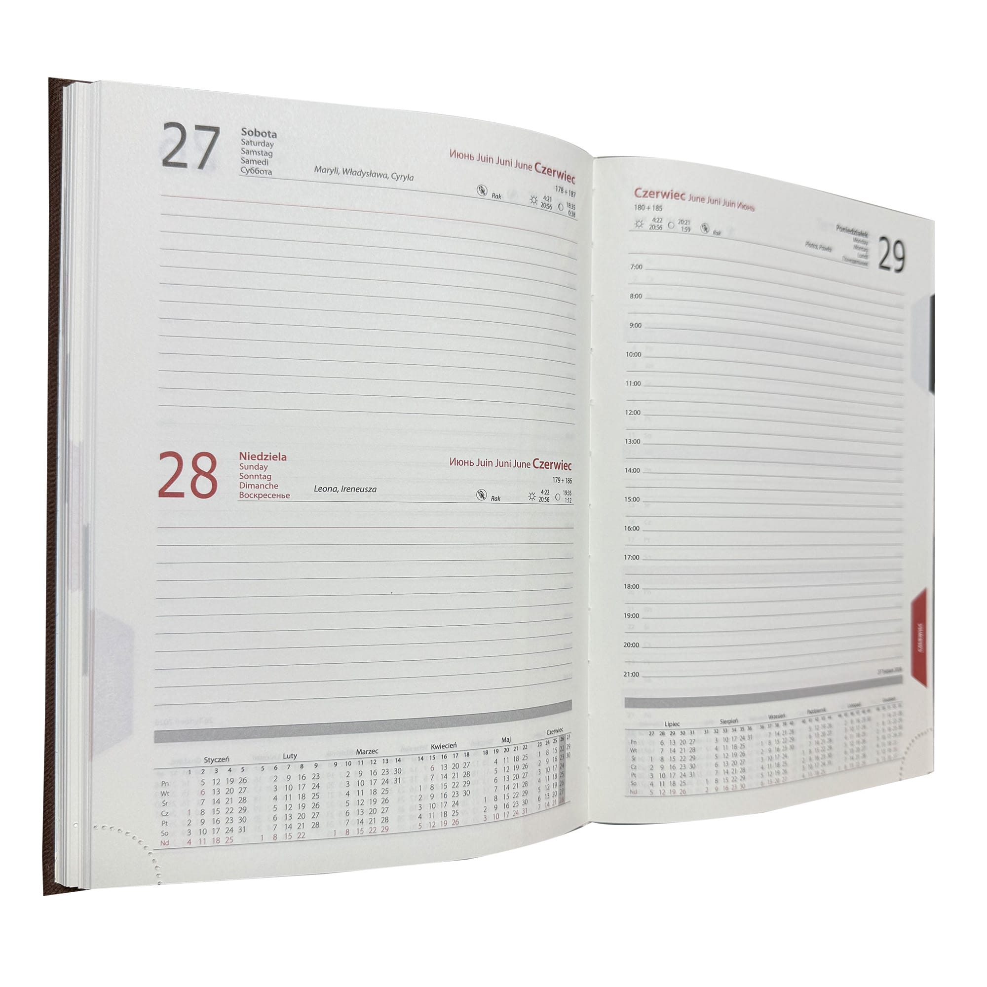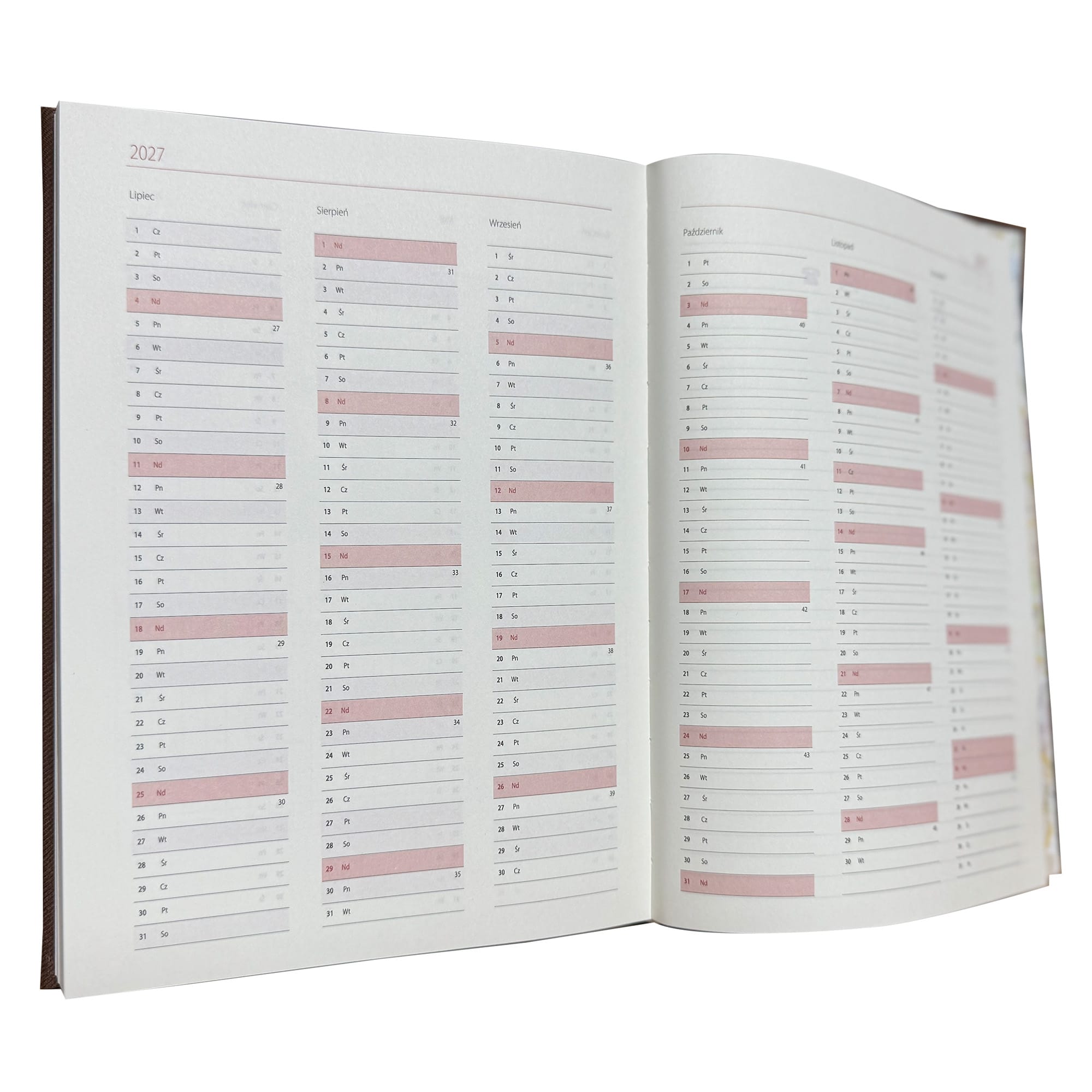 - układ to 1 dzień na 1 stronie, sobota i niedziela na 1 stronie, przed każdym miesiącem terminarz miesięczny