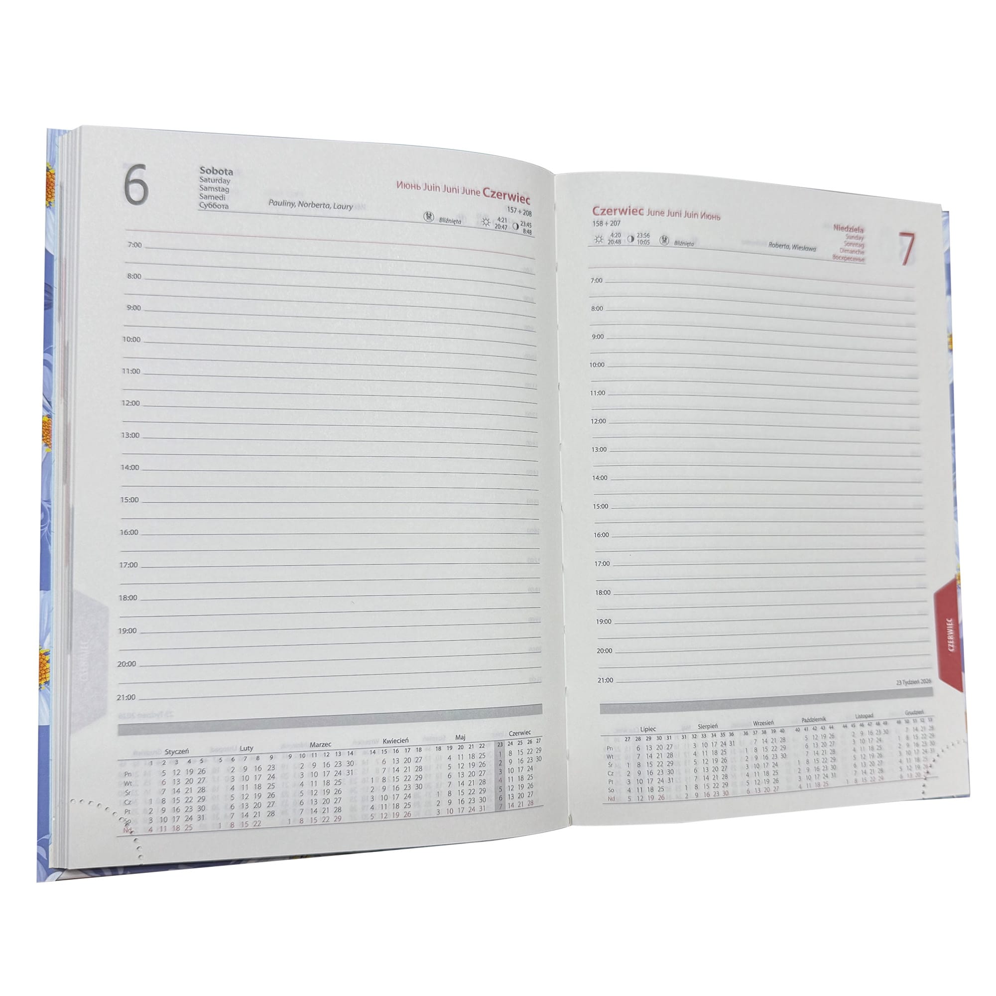- każdy dzień roku znajduje się na osobnej stronie, sobota i niedziela także osobno