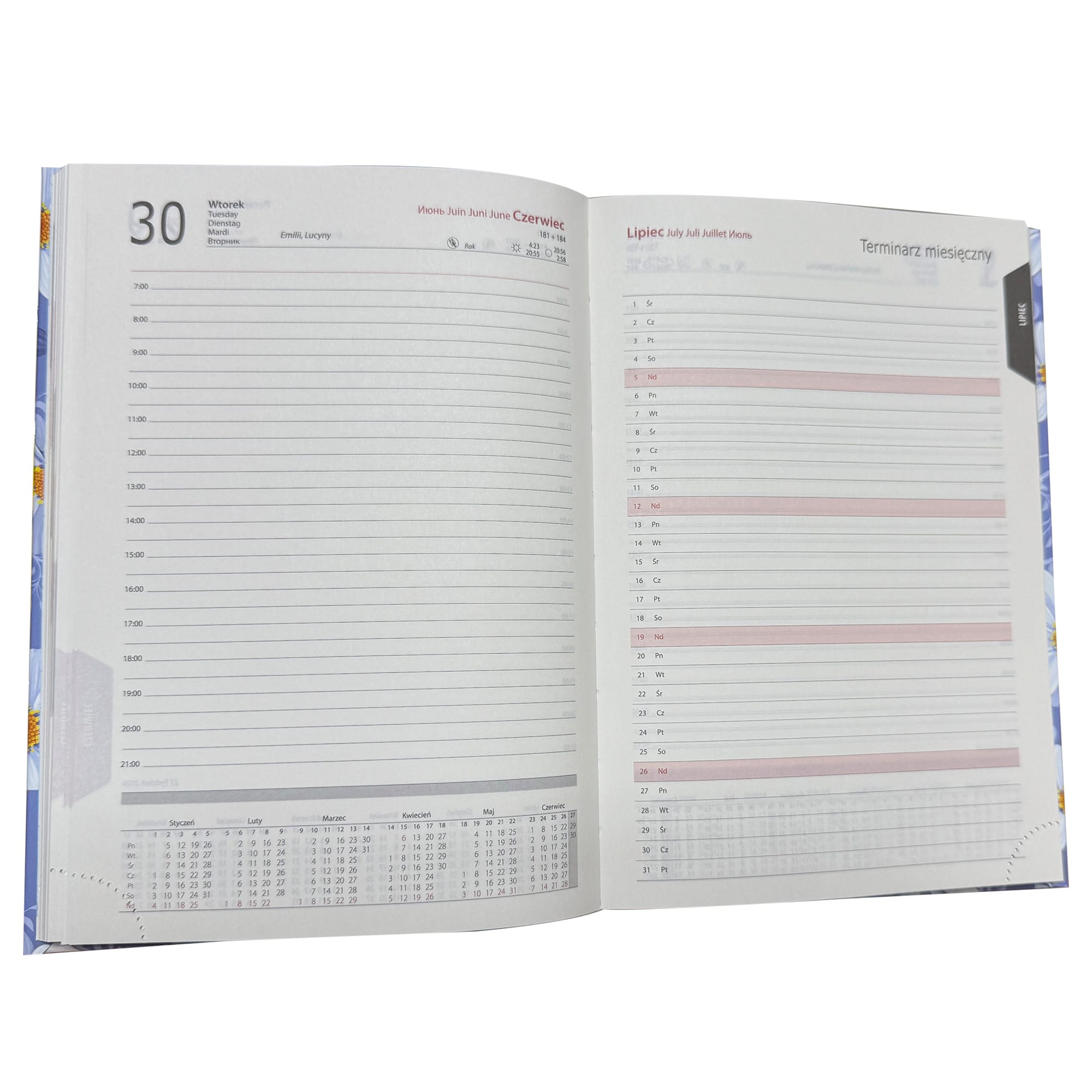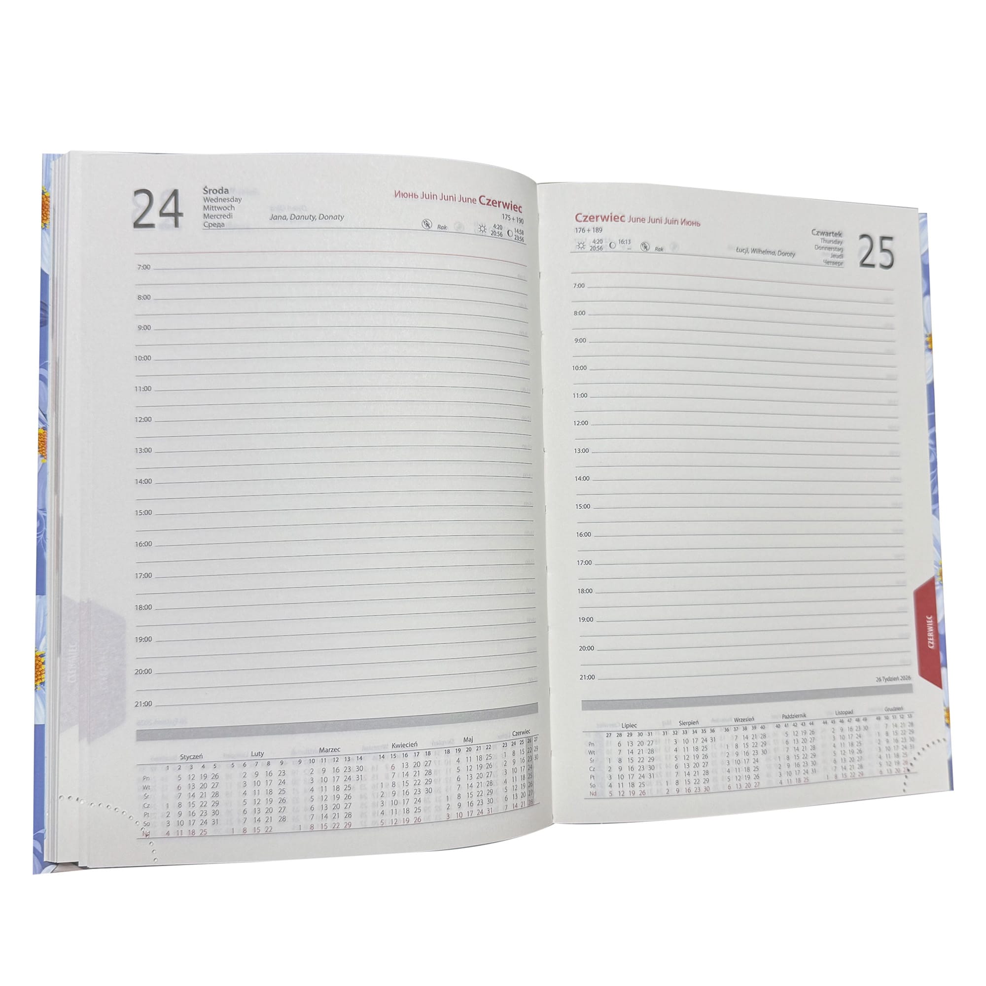 - każdy dzień roku znajduje się na osobnej stronie, sobota i niedziela także osobno