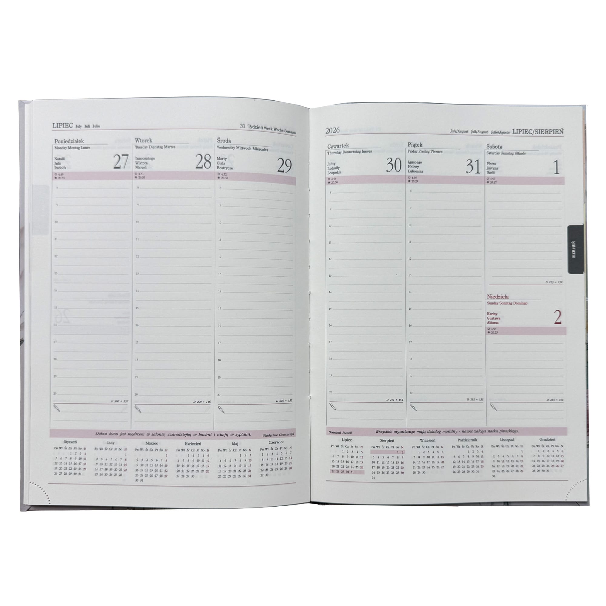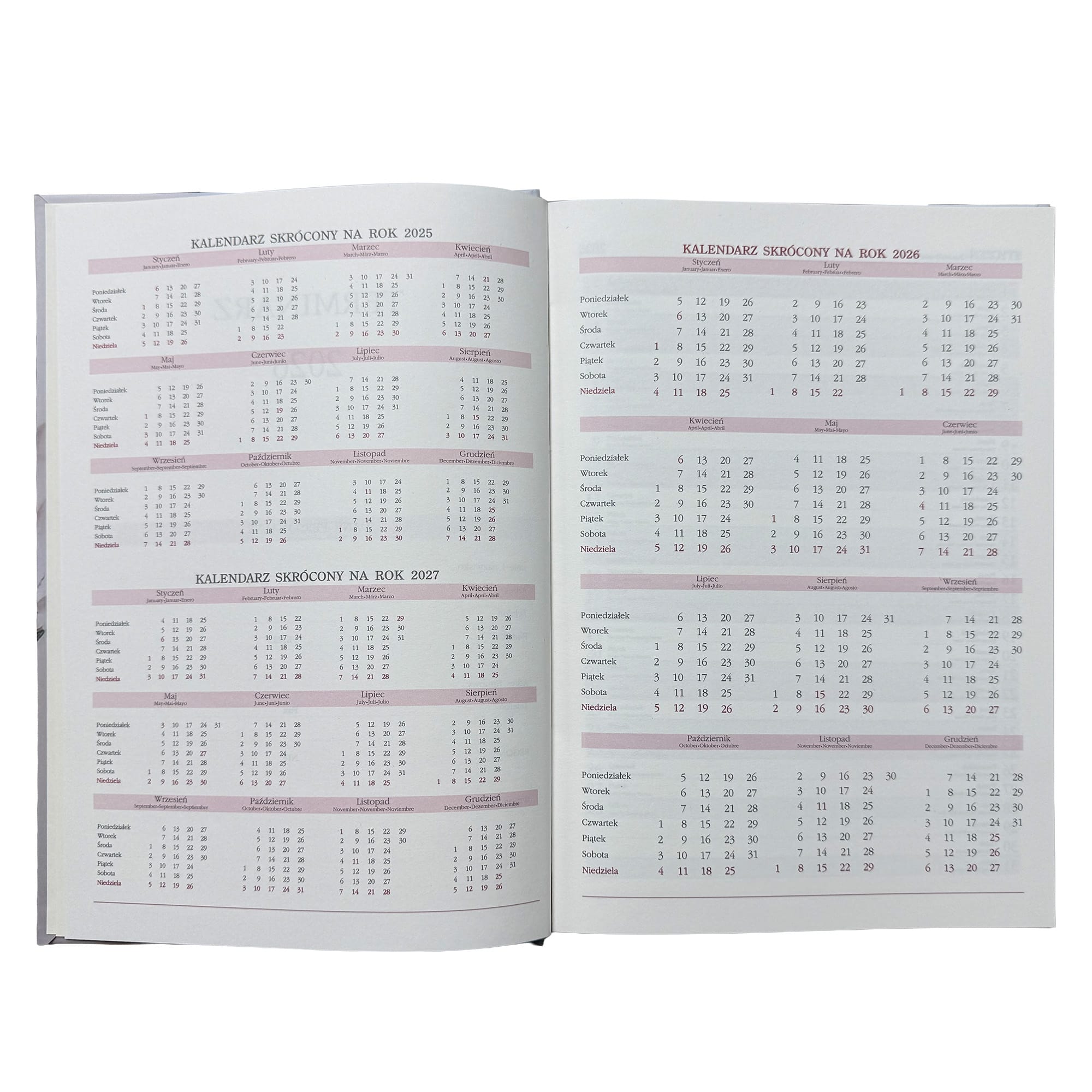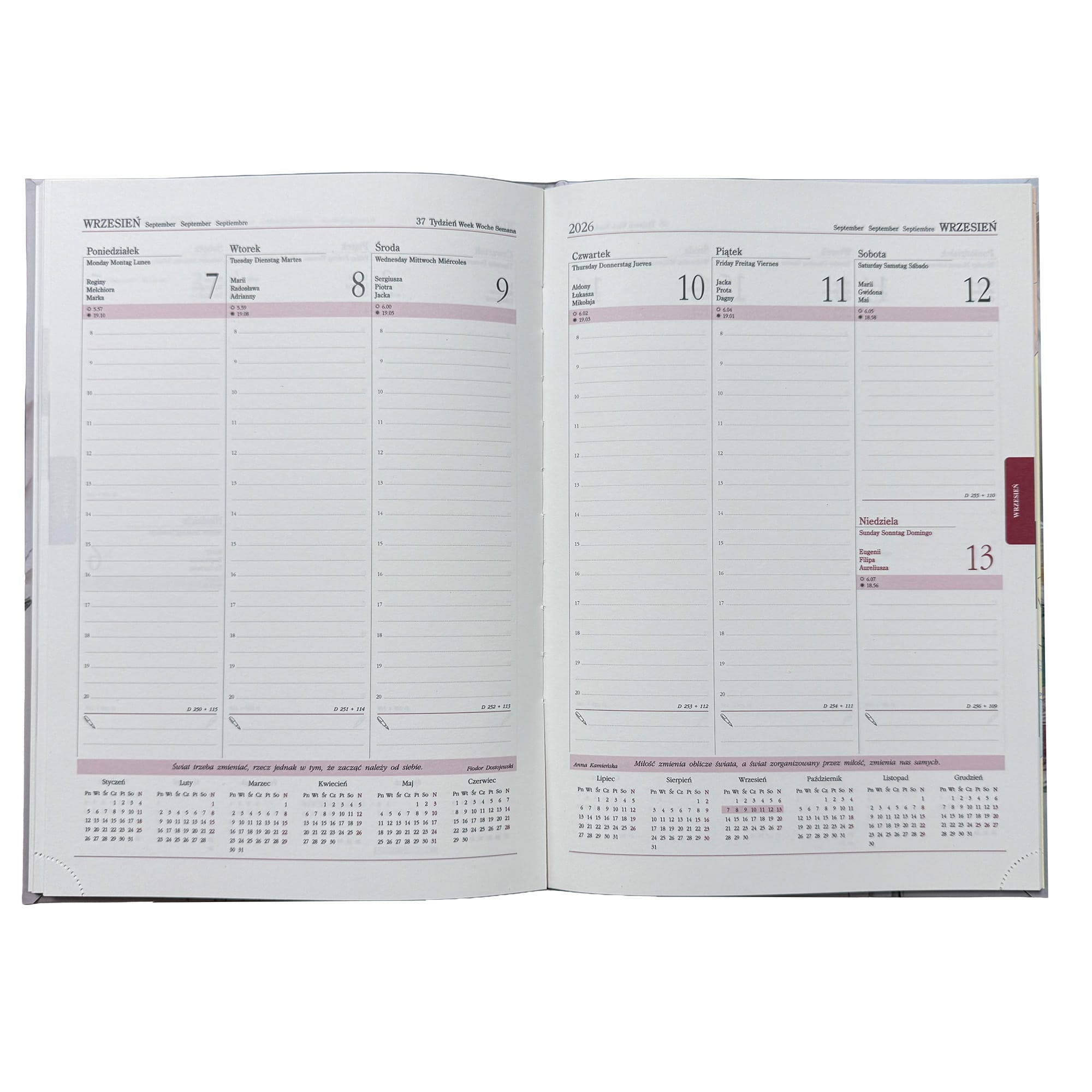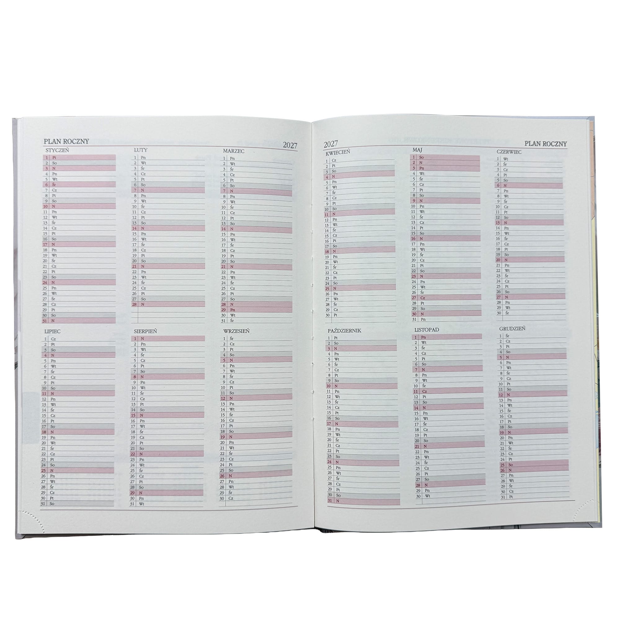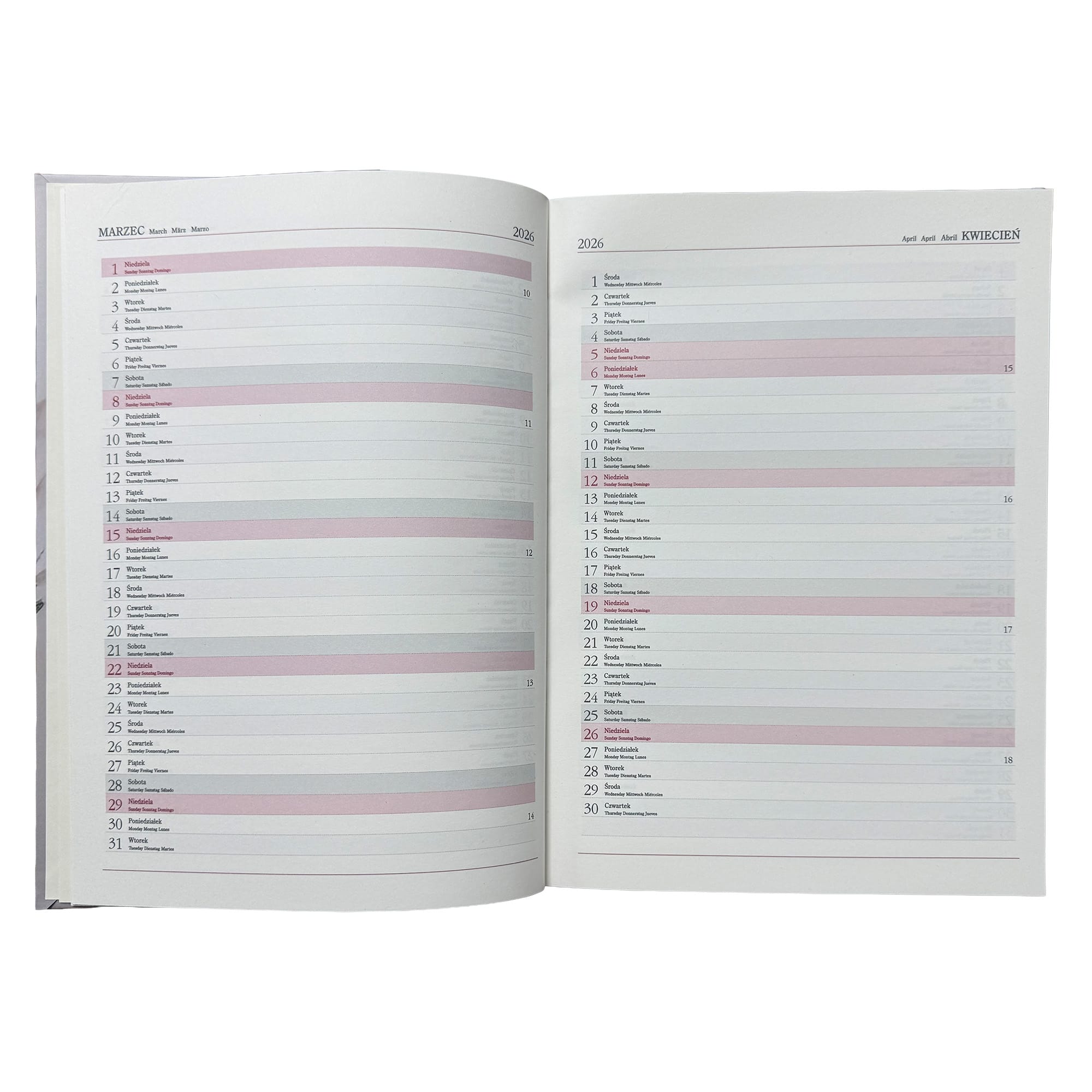 - kalendarz formatu A4, układ tygodniowy, okładka aksamitna soft touch, papier chamois