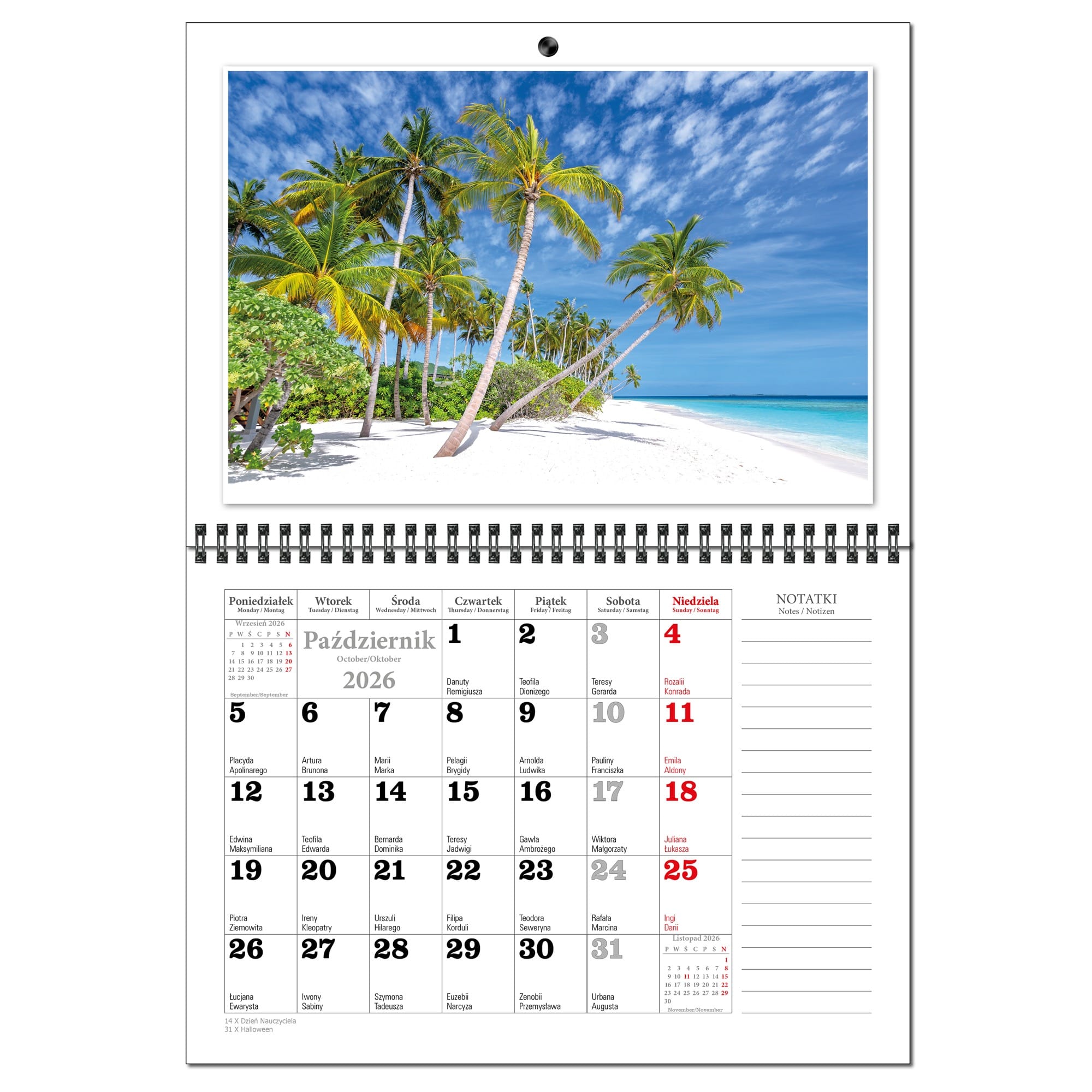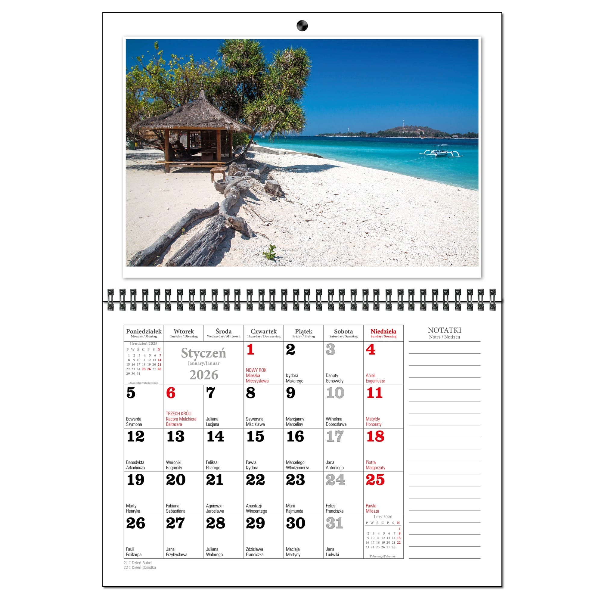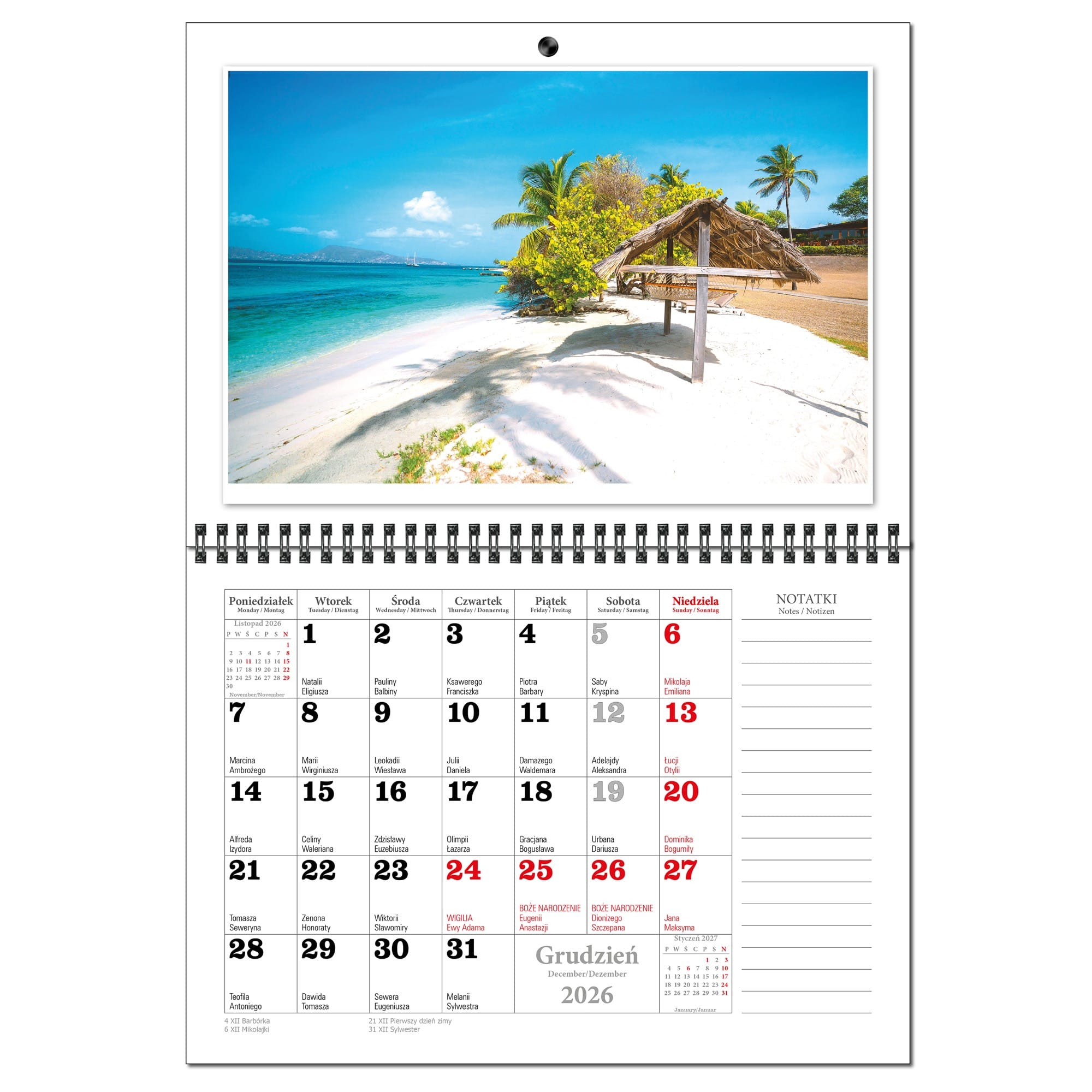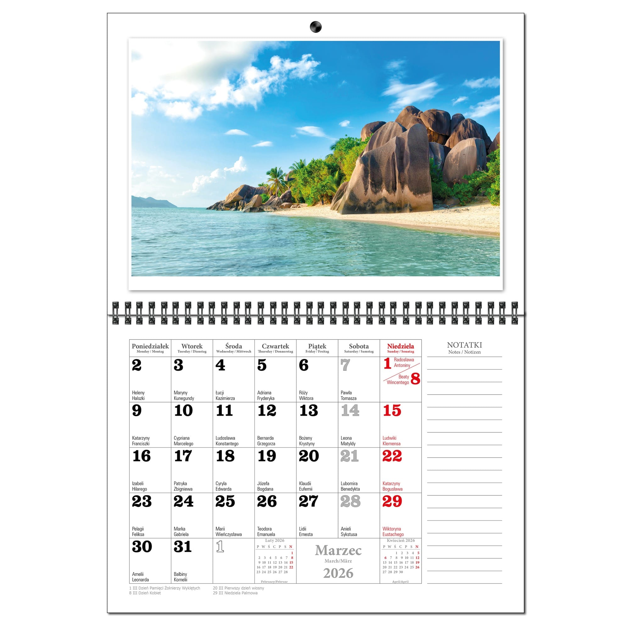 Kalendarz 2026 trójdzielny główka płaska MALEDIWY KSE26-34